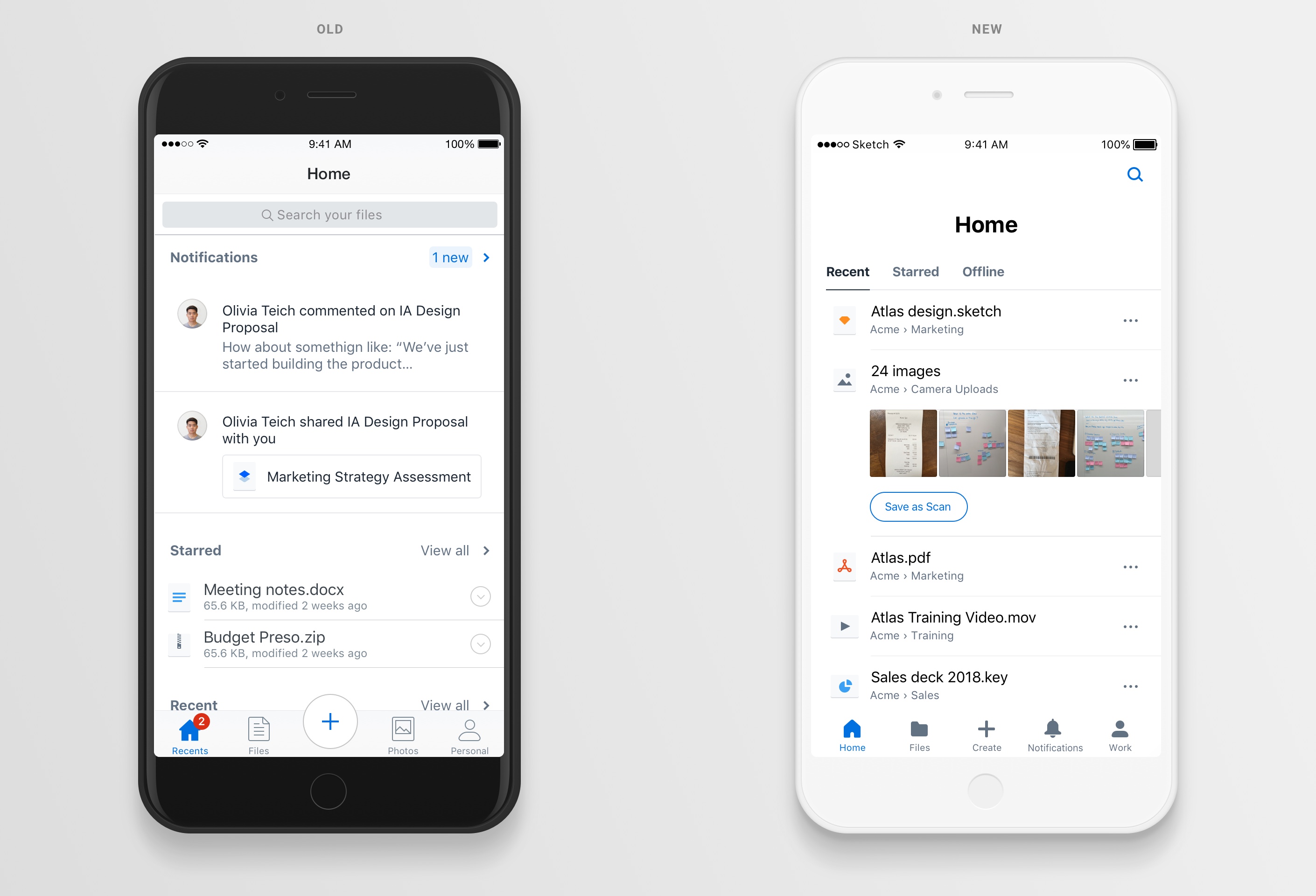 When home was first introduced on mobile, it was a dashboard of distinctive widgets that provided a wide array of functionality from starring to notifications. Through testing and crunching analytics we discovered users actually used Home mainly to access recent files…which the old design was burying beneath the fold. The new design of home refocuses the experience around Recents and creates a more scalable layout for other features through use of a tabbed menu.